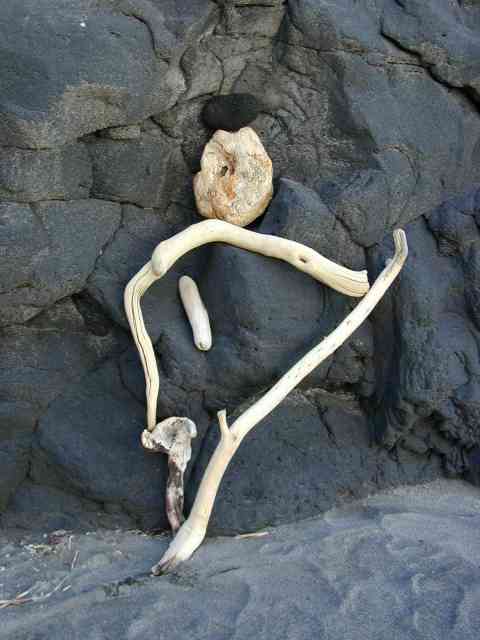 Skulptur : Entstehung eines Strandkunstwerks mit Treibgut und Lavabrocken am Basaltfels
