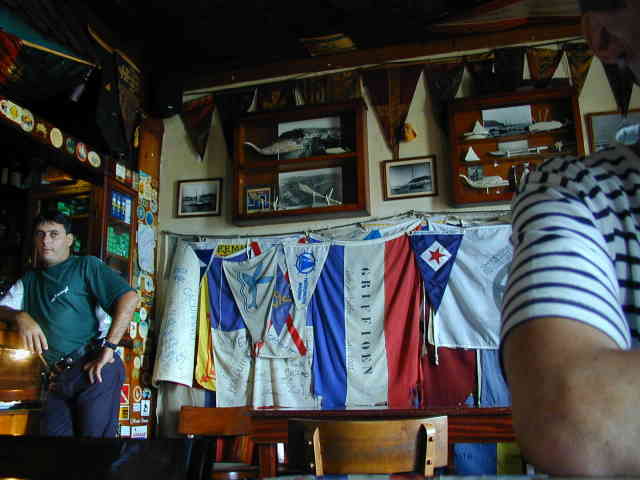dient weiterhin als inoffizielle Poststation für Transatlantiksegler . Das Café ist bekannt für seine maritime Atmosphäre, die von Wimpeln, Flaggen und Schiffsdekorationen geprägt ist. Besonders berühmt ist der Gin Tonic, der als Spezialität des Hauses gilt. Außerdem sollte man unbedingt den Schokoladenkuchen probieren, der bei Stammgästen sehr beliebt ist . |
