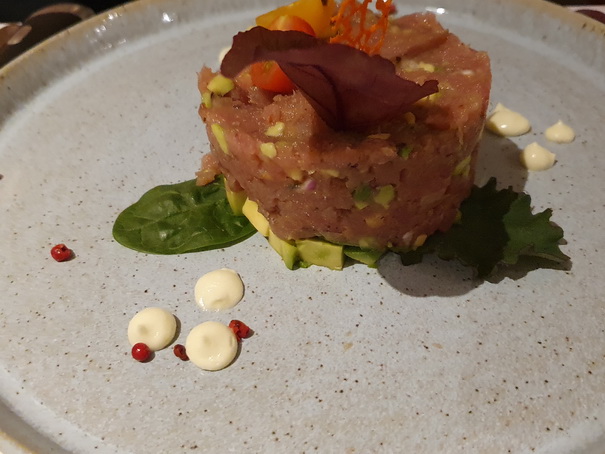 Gemischte Vorspeise ............................... individueller Preis Mixed starter according your personal selection Individual price Caesar Salad ........................................................................ 9,- € Panzanella Salat mit Endivien, Avocado, Gurke Tomate und Kalamata Oliven ........................................ 11,- € Salad with white hawkweed, avocado, cucumber, tomatoes and Kalamata olives Büffel Mozzarella mit bunten Tomaten, Fleur de Sel Basilikumpesto und gereiftem Balsamico ................... 13,- € Buffalo mozzarella with colorful tomatoes, fleur de sel, basil pesto and aged balsamico Vitello Tonnato hauchdünne Kalbfleischscheiben mit Thunfischcreme und Kapernäpfeln ...................... 14,- € Wafer-thin slices of veal with tuna fish cream and caper apples Rinder Carpaccio vom Hereford Prime mit Trüffelöl, Rucola und Parmesan ............................ 15,- € Beef carpaccio from Hereford Prime with truffle oil, rocket and parmesan Glasschrank Classic Dreierlei Riesengarnelen im Kokosmantel mit Mango Chutney Sauce Aioli und Wasabi Mayonnaise ............................ 17,- € Black Tiger Prawns in coconut shell with mango chutney, aioli and wasabi mayonnaise Tatar vom Yellow fin Thuna Sashimi Qualität mit Avocado und Sojasauce ........................................... 18,- € Tatar of yellow fin tuna with avocado and soy sauce Handgeschabtes Rinder Tatar Classico vom Hereford Prime ...................................................... 18,- € Beef Tatar Classic Style of Hereford Prime Beef