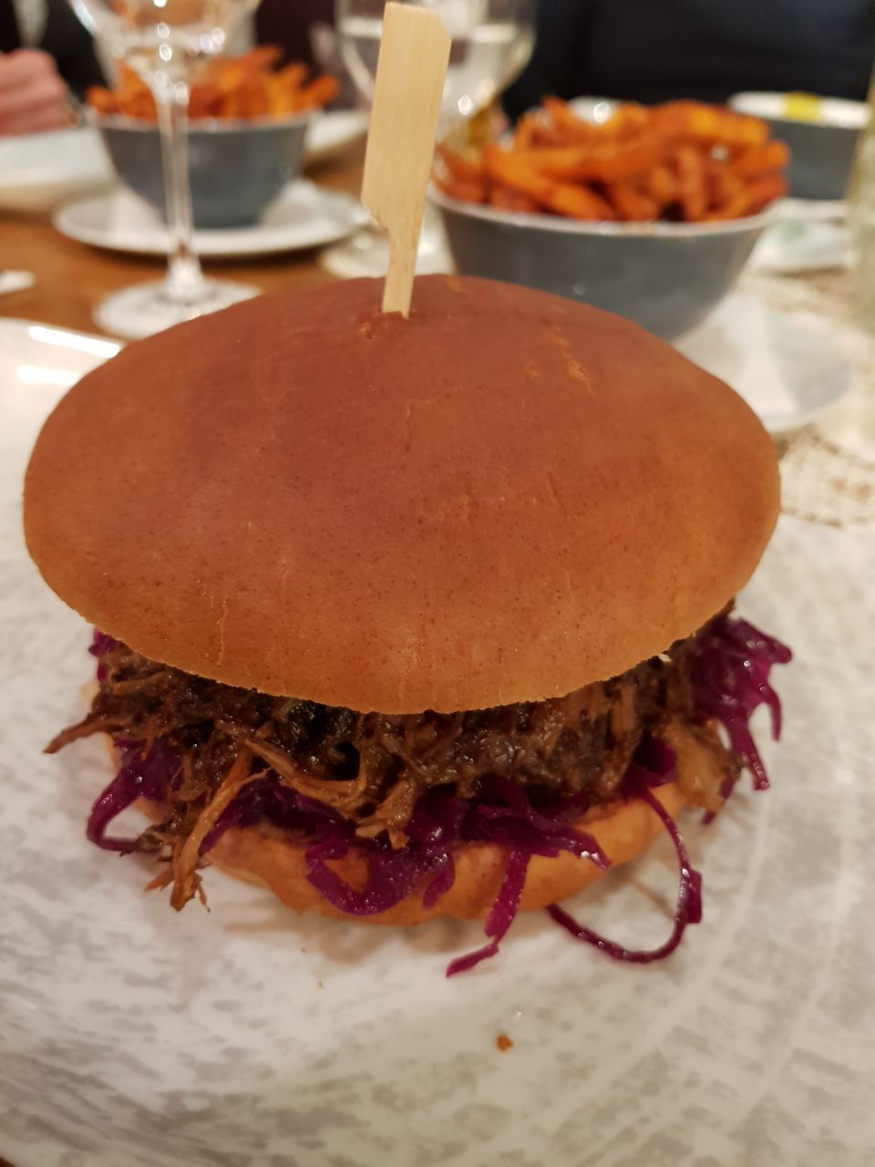gezufpter Sauerbratenburger mit Relish + Rotkohl