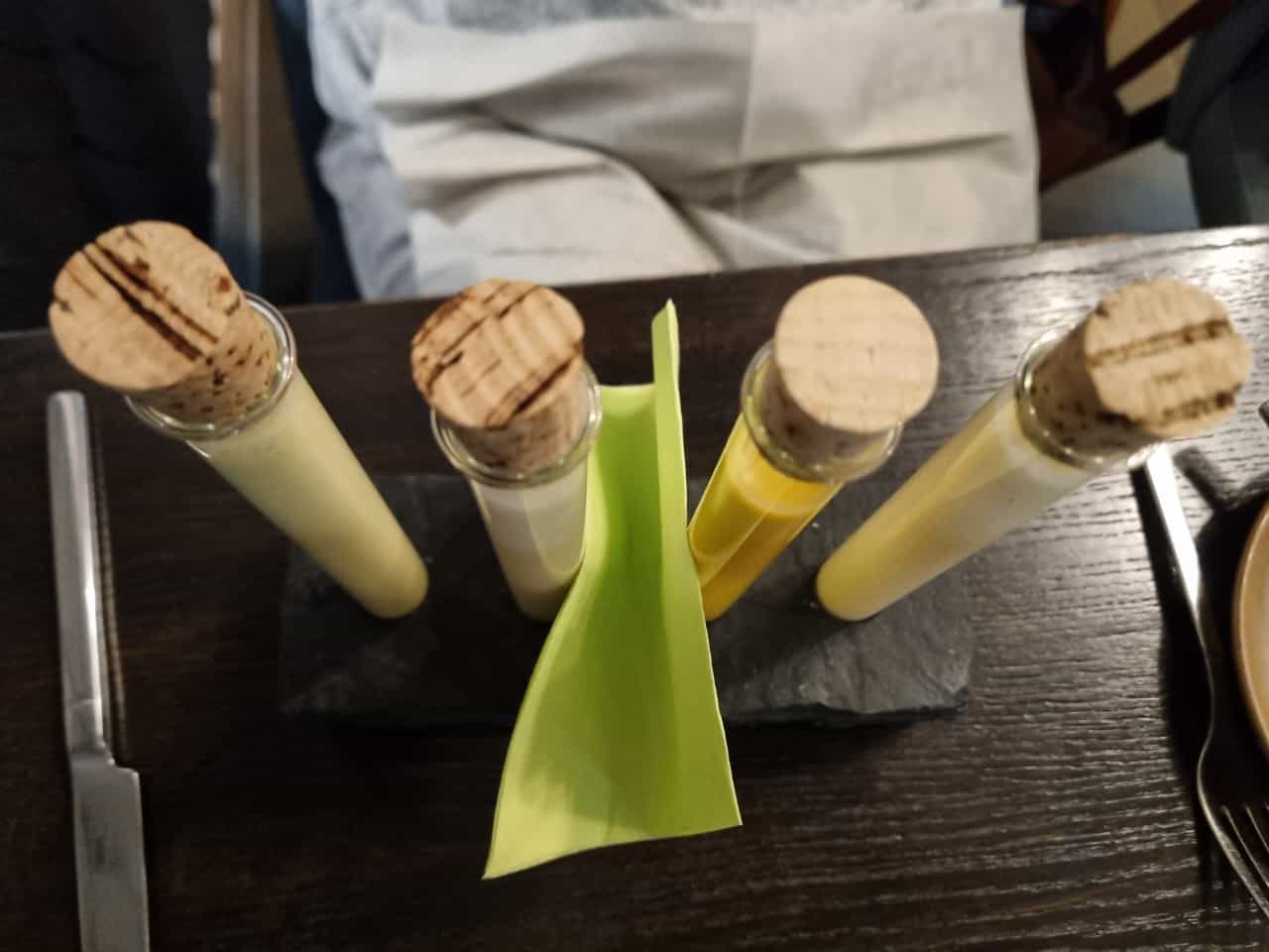SUPPENAPOTHEKE 4 kleine Suppen im Reagenzglas serviert |