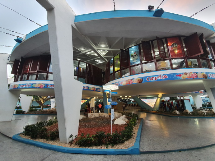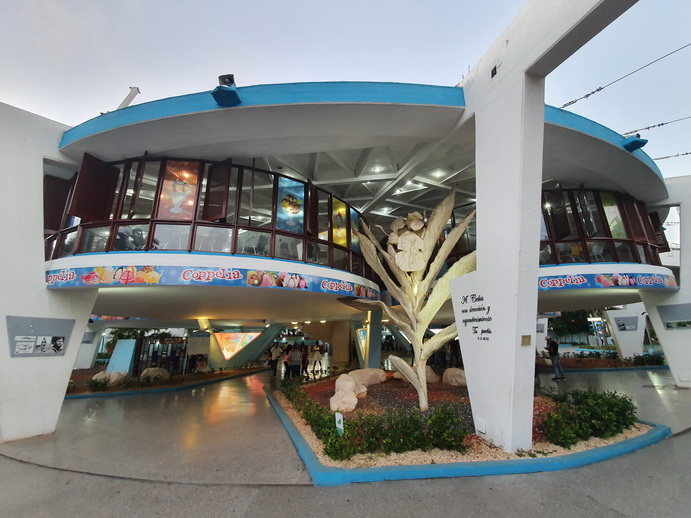Die Coppelia in Havanna ist ein Gebäude der kubanischen Revolution aus dem Jahr 1966. Es besteht aus fünf weißen Granitscheiben, die an eine große schraubenförmige Treppe angebaut sind, mit Trennwänden aus Holz und getöntem Glas, die alle unter einem großen runden Dach liegen, das von zwölf Spinnensäulen aus Stahlbeton getragen wird. Das Gebäude in Form einer fliegenden Untertasse stellt ein UFO dar, das in Havanna gelandet ist und eine der größten Eisdielen der Welt ist[5]. Mit maximal 1000 Gästen befindet es sich im Teil der Calle 23, der als La Rampa im Stadtteil Vedado bekannt ist, und nimmt den gesamten Stadtblock zwischen Calles 23 und 21 sowie Calles K und L ein. Coppelia ist seit seiner Eröffnung im Jahr 1966 sowohl für Einheimische als auch für Besucher ein bedeutendes Wahrzeichen der Stadt, erlangte aber zusätzlichen Ruhm, als es in einem der meistgesehenen kubanischen Filme, Strawberry and Chocolate, zu sehen war[6].