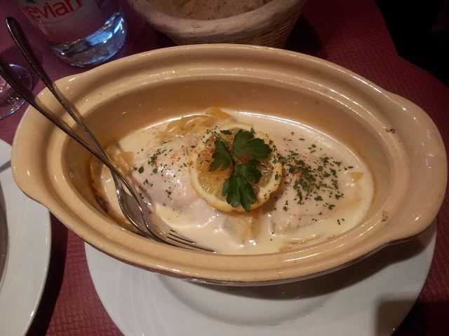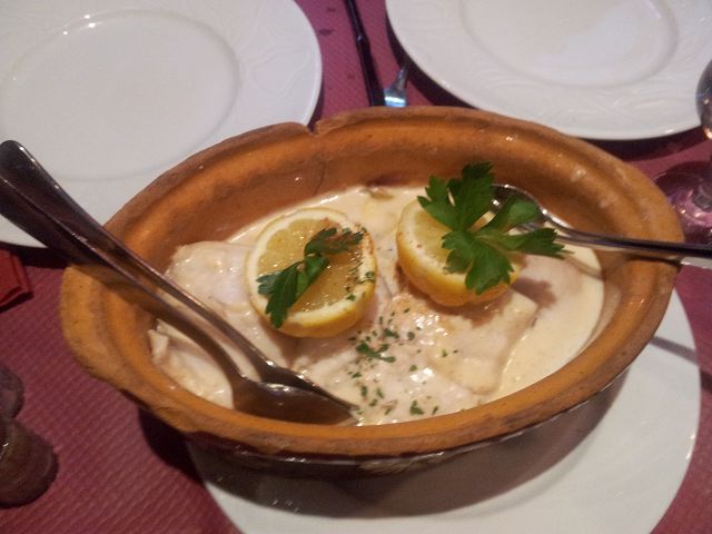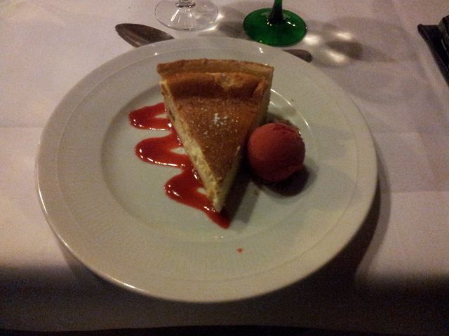 | Maison Kammerzell Sauerkraut unter Zanderspeckmatelkruste | selbstgemacher Käsekuchen mit Sorbertkugel Himbeer |
