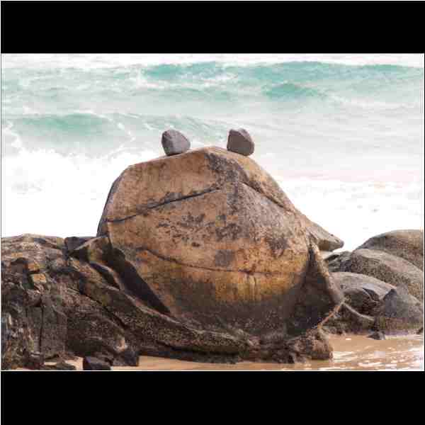 vorbei am Frosch aus Stein vorbei an den Sanddünen mit Steinunterbau