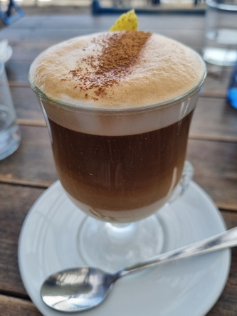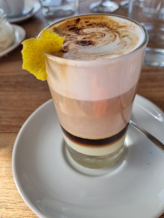 Kondensmilch in das Glas geben. Likör einschütten. Geschäumte Milch darauf geben. Espresso langsam nachschütten oder das Glas unter den Kaffeeauslauf der Espressomaschine stellen und Espresso eingeben. Zitronenstückchen zugeben. Mit Zimt bepudern. Servieren. |