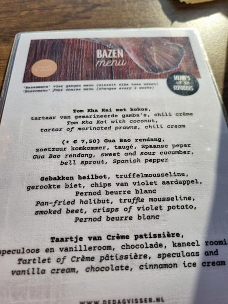 Dagvisser 1-6   das Fischrestaurant  Tag 1 Dagvisser   das Fischrestaurant  Tag 1 Bazen Menü  Bazen Menu’ three or four course menu (changes every 2 weeks) Vegetarisch 3 gangen menu  Vegetarian three-course menu Senioren menu elke maandag verwelkomen wij -plussers met een 3 gangen diner inclusief één glas wijn en koffie Seniors menu, every Monday we welcome our seniors for a three-course dinner, this menu includes one glass of wine and coffee