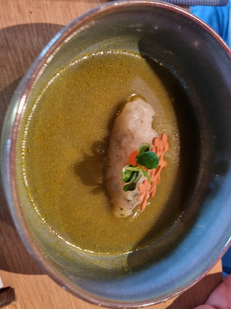 Ceviche  Ceviche van zeebaars, rocoto peper, citroen, koriander, knoflook, gember, zoete aardappel, truffelaardappel Sea bass ceviche, rocoto, lemon, coriander, garlic, ginger, sweet potato, truffle potato Rundercarpaccio met truffelolie, rucola, uitgebakken Vorspeise Bazen menü  Tom Ka Gai Tartar von de Marinierte Gambas