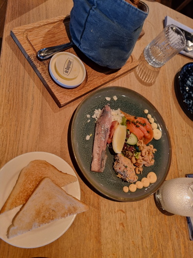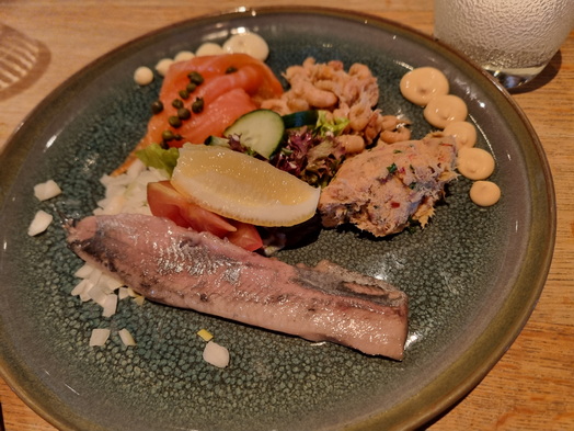 | Dagvisserrestaurant Leyklade Vorspeiseplatte 4 mal Fisch geräuchterter Zalm = Lachs Hering Makrelensalat Hölländische Krabben | Dagvisserrestaurant Leyklade Schevenings Rondje |