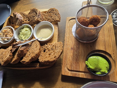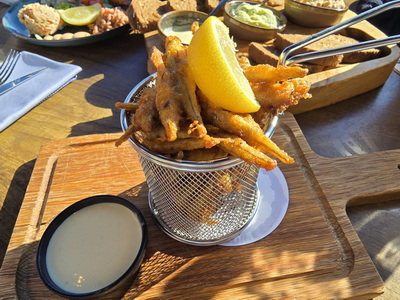 | Brot und Garnelebitterballen mit grünem Senf | Dagvisserrestaurant LeykladeCeasar salade mit Gambas granpadano anchovis |