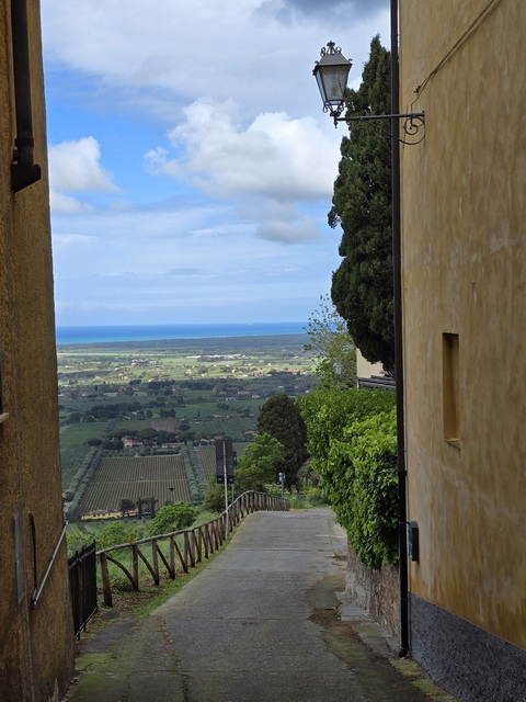 | Castagneto Carducci grosses weinbergdorf Kirchenkuppel Chiesa del Santissimo Crocifisso | Castagneto Carducci steile enge Gässchen und Treppen |