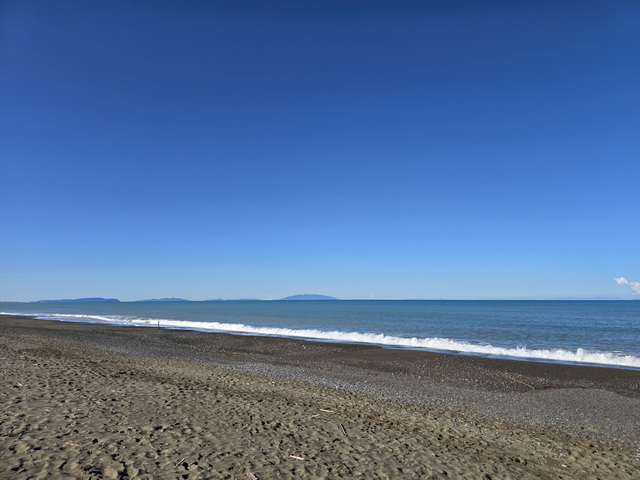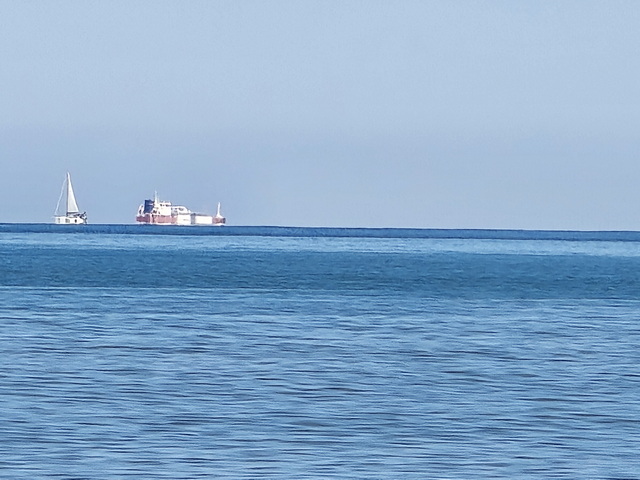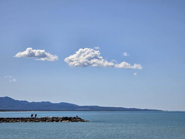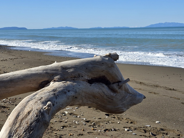 | Park Hotel Marinetta Beach Wanderung am Strand nach cecina cecinabeachwalk Hund aus Holz blickt nach Capraia Dogbeach Hundestrand | 2 Schiffe vor Cecina Wanderung bis cecina beachwalk |
