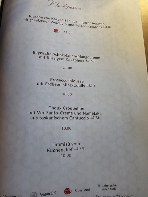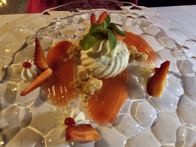 | Ristorante Anfora Di Baratti Choux Croqueline mit Vin Santo Creme und Namelaka aus toscanischem Cantuccio Knusperschicht windbeutel + Liquer | Ristorante Anfora Di Baratti Prosecco Mousse mit erdbeer Minz Coulis |