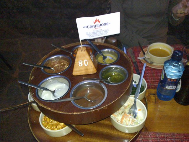 | Carnivore restaurant Nairobi Wie der Name schon sagt, geht es in diesem Restaurant nur um eins: Fleisch, Fleisch und nochmals Fleisch. In diesem Spezialitäten-Restaurant werden alle nur erdenkliche Arten von Fleisch angeboten werden: Nicht nur Rind, Lamm, Schwein oder Huhn - auch Zebra, Antilope, Strauß oder Krokodil.( momentan aber nicht ) Zubereitet wird das Fleisch an einem riesigen Grill, an dem bis zu 10 Köche arbeiten. Der Kellner kommt mit dem jeweiligen Fleischspieß an den Tisch und man kann - muss aber nicht - alles probieren. Selbstverständlich gibt es daneben auch auf dre Karte mit Salate, Suppen, Fisch oder Nudelgerichte. |