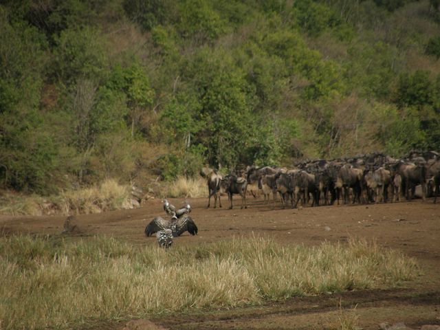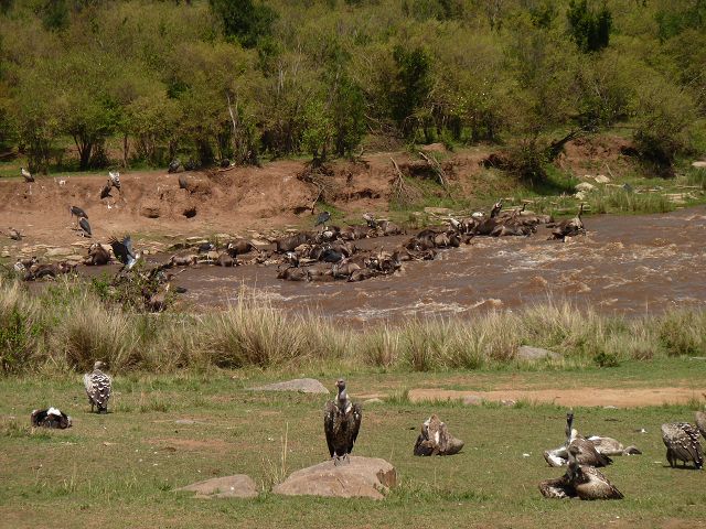 | reich gedeckter Tisch gnus im Mara River Geier Weißrückengeier | |