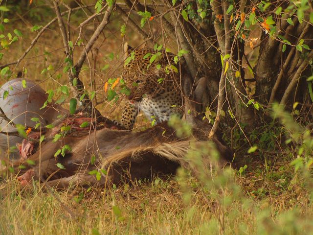 Kill der Leopardin Wildebeest Gnu genüsslich ißt Sie Ihr Frühstück