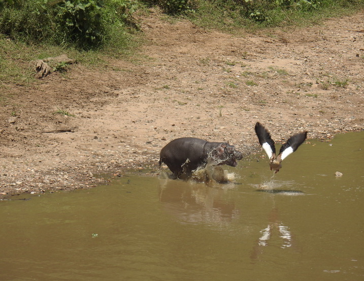 | Hippopool Flusspferde im Seitenarm des Mara River Kiboko 3 | Masai Mara Kidogo Kiboko playing with egyptian goose |