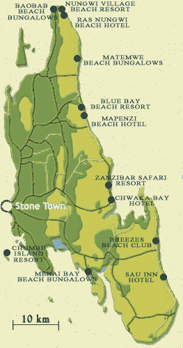 Lage: an der Ostküste Sansibars, direkt am naturbelassenen Strand vor dem azurblauen Indischen Ozean, ca. 60 km vom Flughafen und von Stone Town entfernt.