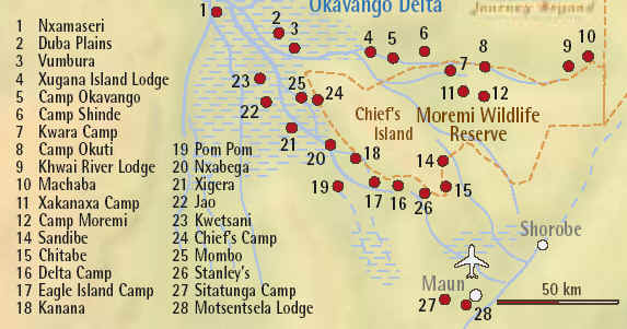 Tag 14 Mittwoch Flug WDK - Maun SW 140 Ker Downey Inc. Okavango Fuß-Spuren im Okavango-Delta Unterkunft mit A/Ü/F im Delta 4-tägiges Busch-Erlebnis im Okavango Delta ab/bis Maun ins Shine Zelt Camp ( Shinde Tent Camp ) Erleben Sie das zeitlose und unberührte Afrika der ersten Erforscher. Nach einem Charterflug von Maun und einer Motorbootfahrt gelangen Sie in die entfernten Gebiete des Okavango Deltas, wo es weder Landebahnen, Straßen oder sonstige Fahrspuren gibt. Auf Fuß-Safaris und Mokoro-Fahrten (Einbaum) werden Sie von einem erfahrenen Buschführer in die Geheimnisse des Deltas eingeweiht. Wildherden wandern hier frei, und Sie haben optimale Möglichkeiten zur Tierbeobachtung.Die Camps werden mit großen Zelten (eingenähter Boden, Dusche/WC am Zelt) aufgebaut. Die Buschküche bietet einen hohen Standard (frisches Gemüse, Obst). Exzellente südafrikanische Weine stehen neben anderen Getränken zur Auswahl. Ab Maun Charterflug ins Delta. Fahrt im Motorboot über Lagunen und durch papyrusbestandene Wasserwege zum Basiscamp. Nach einer Erfrischung geht es am Nachmittag zu einer nahen Insel. Sie erhalten eine Einführung in das Delta und erleben hautnah die Vorteile der Fuß-Safari im Busch. Gegen Sonnenuntergang Rückkehr zum Camp. Nach einer erfrischenden Dusche können Sie bei einem 3-Gänge Abendessen mit ausgezeichneten südafrikanischen Weinen den Tag ausklingen lassen.