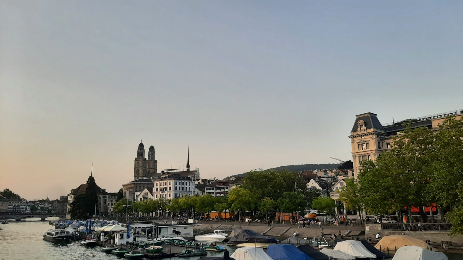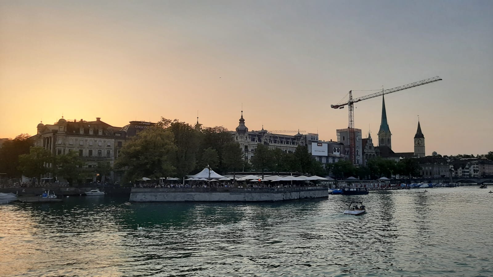 Biergarten am Fluss von zwei Türmen der Kirche in Zürich