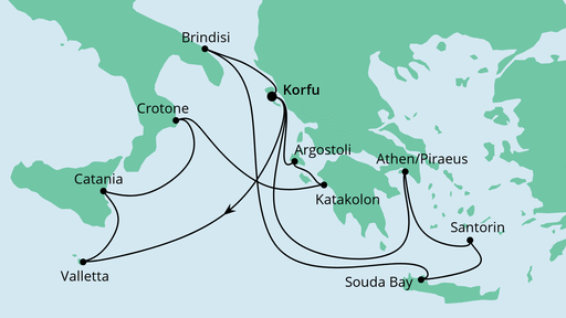 14.07.2021 - Dienstag Korfu 22.00 Uhr 15.07.2021 - Mittwoch Erholung auf See 16.07.2021 - Donnerstag Piräus 07.00 Uhr 19.30 Uhr 17.07.2020 - Freitag Santorin 08.00 Uhr 19.30 Uhr 18.07.2020 - Samstag Souda-Bucht Kreta 06.00 Uhr 19.30 Uhr 19.07.2020 - Sonntag Erholung auf See 20.07.2020 - Montag Brindisi / Italien 08.00 Uhr 18.00 Uhr 21.07.2020 - Dienstag Korfu / Griechenland 05.00 Uhr 22.00 Uhr 22.07.2020 - Mittwoch Erholung auf See 23.07.2020 - Donnerstag Valletta / Malta 08.00 Uhr 22.00 Uhr 24.07.2020 - Freitag Catania (Sizilien) / Italien 08.00 Uhr 21.00 Uhr 25.07.2020 - Samstag Crotone / Italien 08.00 Uhr 17.00 Uhr 26.07.2020 - Sonntag Katakolon (Olympia) / Griechenland 10.00 Uhr 22.00 Uhr 27.07.2020 - Montag Argostoli / Griechenland 07.00 Uhr 19.30 Uhr 28.07.2020 - Dienstag Korfu / Griechenland |