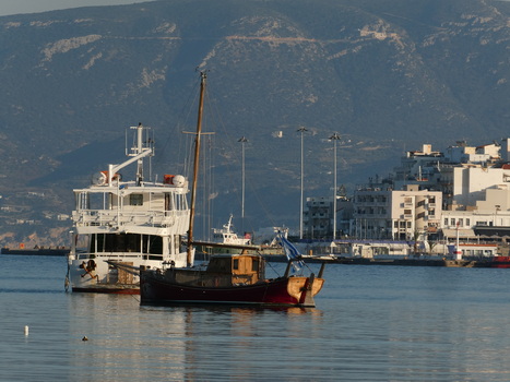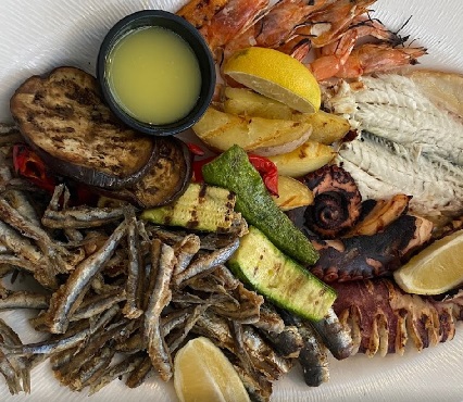 | Agios Nikolaos Hotel Bar achinos Fischplatte mixed Psari https://www.facebook.com/achinoscrete/ | Agios Nikolaos Blick auf Minos Hotelhalbinsel |