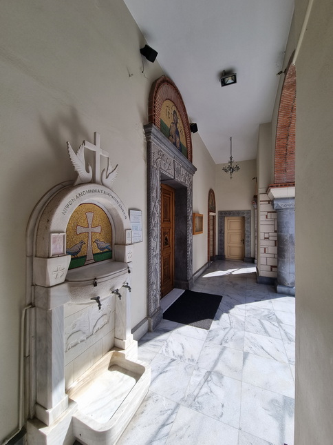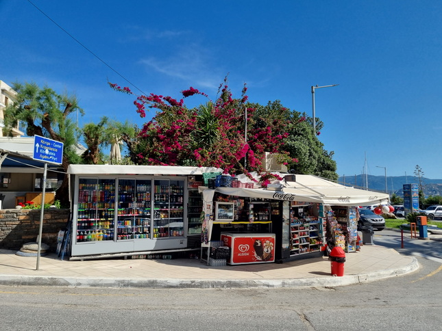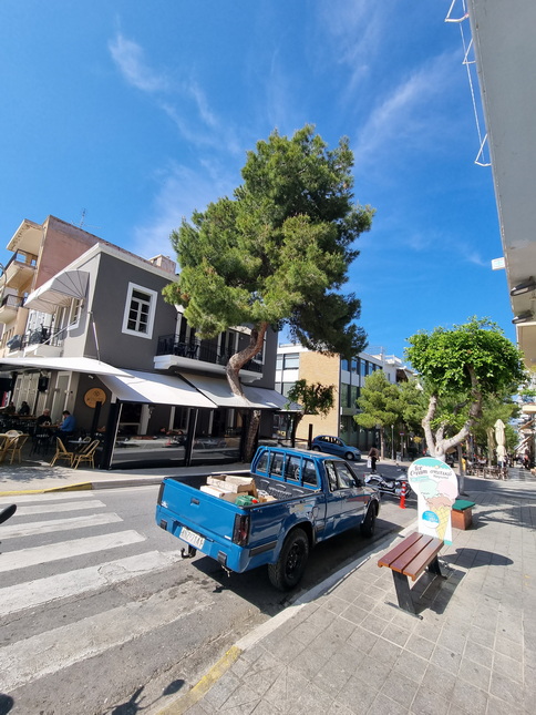 | Agios Nikolaos Cafe mit Kiefer im Sonenschutz | Agios Nikolaos Kirche |