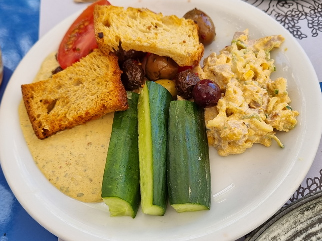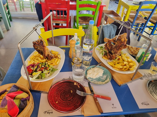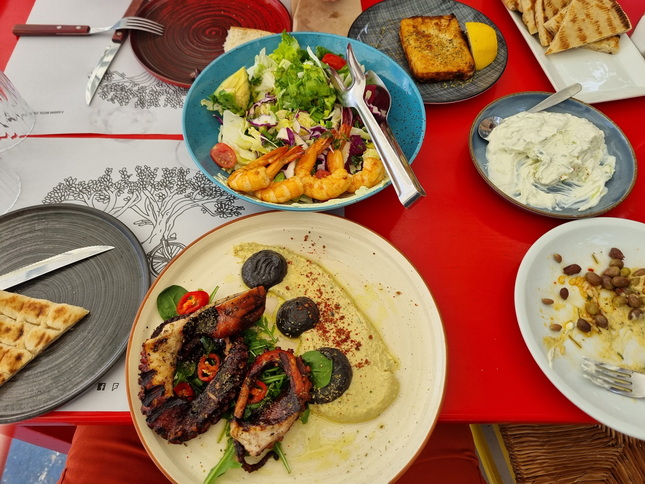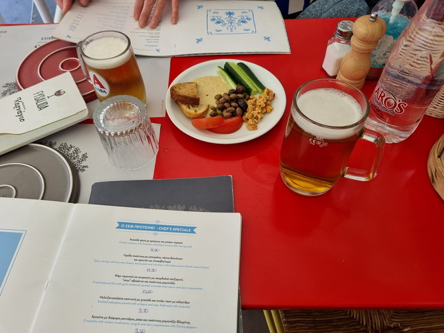 | Restaurant wenn man 2 Bier bestellt automatisch Vorspeise Dakos | Restaurant am Limmni Voulismeni aussicht auf Tauben |