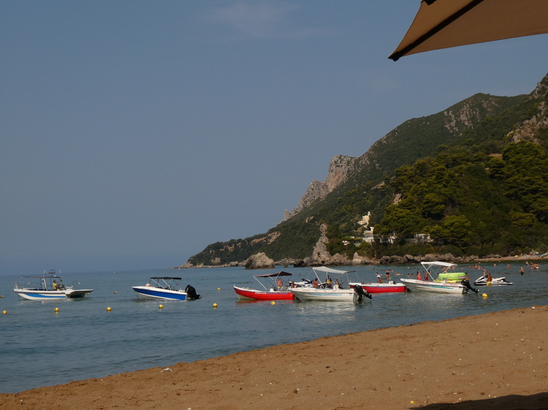 Strandleben Glyfada Beach  Oldtimer Propeller Strand von  Marriott Hotel domes of corfu Glyfada Beach  Bootarmada bereit zur Blue Eye Hole Bucht
