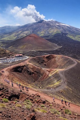 Der Ätna ist, mit einer Oberfläche von etwa 1.250 km2 und einer Höhe von etwa 3.350 m ü. d. M., der größte Vulkan Europas, und kann auch, im Bezug auf die sich in den letzten Jahren wiederholten Ausbrüche, als einer der weltweit aktivsten Vulkane bezeichnet werden. Von seiner Höhe aus herrscht er über Sizilien, über die drei Meere die die Insel umgeben und über Kalabrien. Der Ätna bietet vielfältige und eindrucksvolle Aspekte seiner Landschaft an, wie hunderte von Nebenkratern, spektakuläre Lavaströme, Wälder, Zitrusfrucht-anbauten und grüne Weinberge, die die naturwissenschaftliche Neugier und das touristische Interesse der Besucher aus aller Welt erwecken. Zwei moderne und nagelneue Autobahnen die Palermo und Messina mit Catania verbinden ermöglichen es den Ätna aus jeder Richtung in kurzer Zeit zu erreichen. Die Drahtseilbahn, oder anderenfalls die zur Verfügung gestellten speziellen Geländewagen, erlauben es die höheren Vulkanzonen zu erreichen für einen Ausflug der den Sommerurlaub bereichert und im Winter eine seltene, wenn nicht die einmalige Möglichkeit bietet nur wenige km vom Meer entfernt, Wintersportarten zu betreiben. Der Ausflug wird in den genehmigten Kraterzonen durchgeführt. Die erreichbare Höhe und der Ablauf des Ausfluges können sich gemäß den Genehmigungen der zuständigen Behörden ändern.