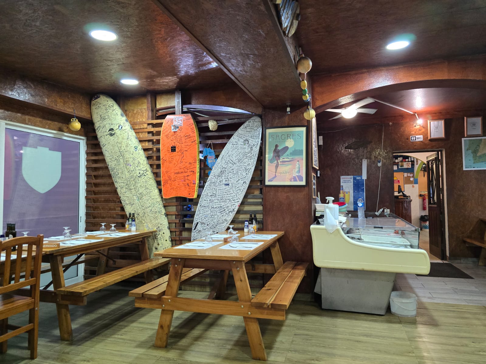 Adega dos Arcos Innen Bämke und hinten Tische und Stühle