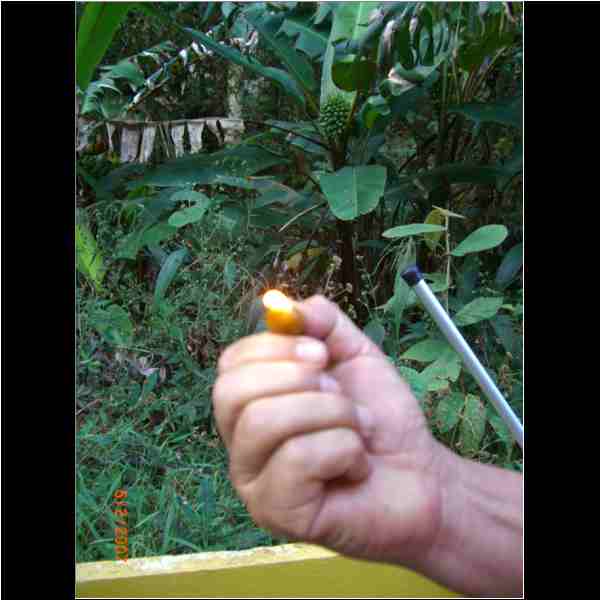 | Petrolbaum Brennendes Gas aus der Frucht Petrolbaum | Bei der Petrolbaumfrucht kann man das aus der Frucht austretende Gas anzünden |