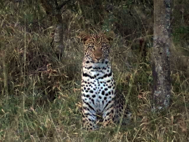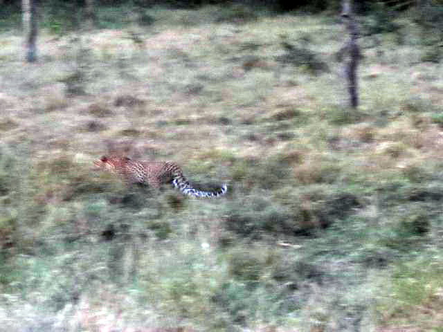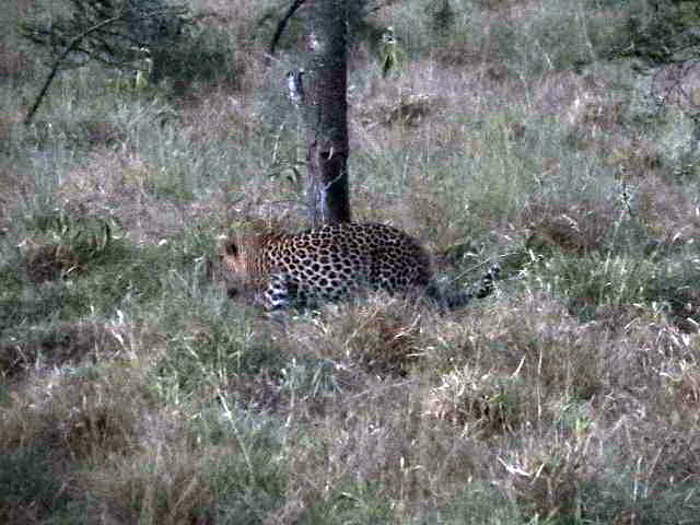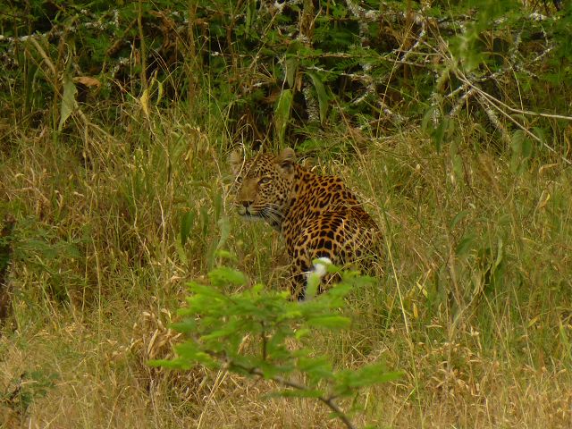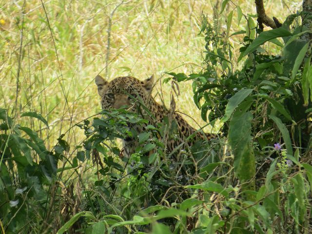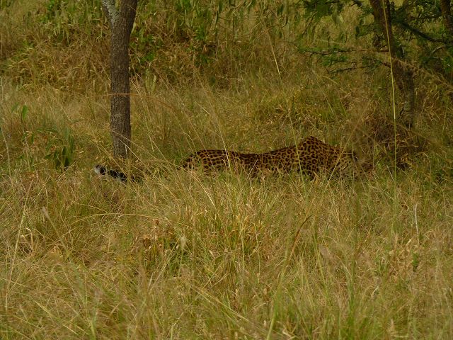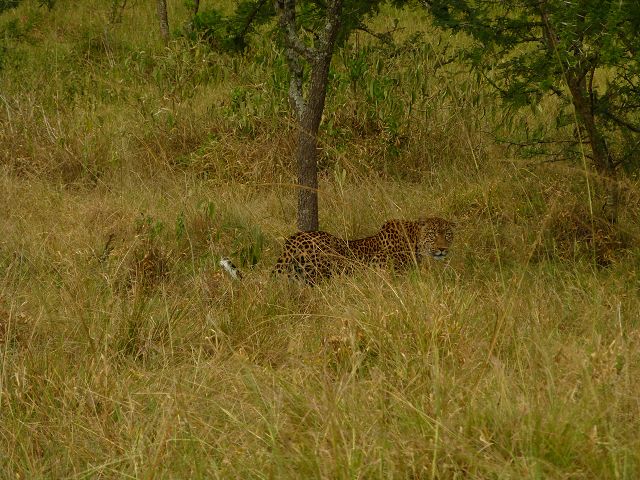 auch so eine Geschichte ……… nach 4 Stunden Fahrt Barabara Bunyoni to Mburo musste unser Fahrer auf die Buschtoilette , also anhalten im Nationalpark Mburo , neben einem Zebra Kadaver ca 25 m vom Weg . Er trat rechts vom Auto aus , bei Ihm sprang ein Wasserbock ins Gebüsch und ich trat links aus und beim pinkeln bemerkte ich , das bei dem Zebra sich ein Leopard davonschlich. Eingestiegen………dann sind wir dann mit dem Auto an den Leopardenbusch gefahren und der Leopard trottete gemütlich davon |