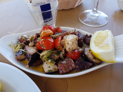 | Malta Gozo Comino Ray's Lido Little Armier Calamari fritti | Malta Gozo Comino Ray's Lido Little Armier Bay Oktopus Pulpo Salat |