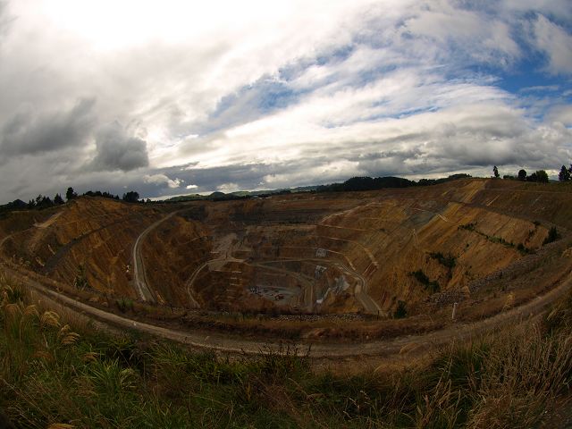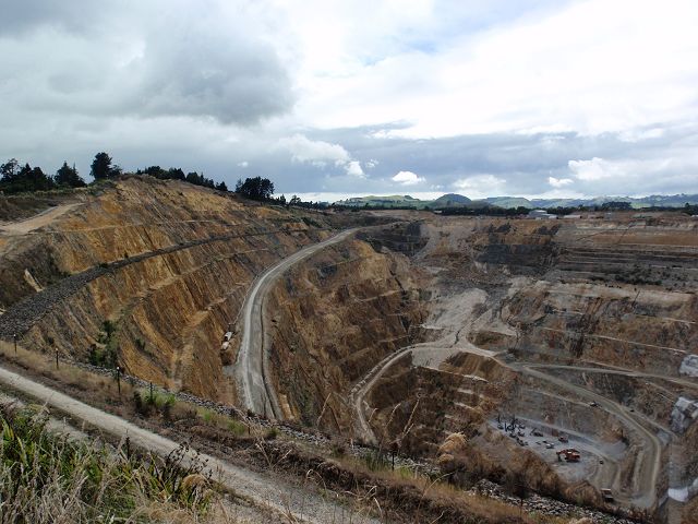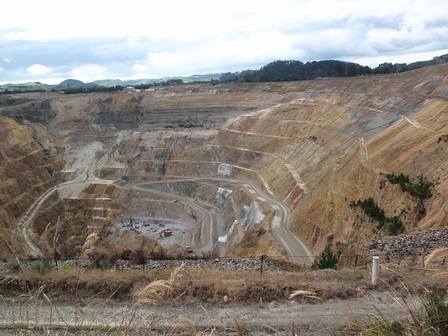 | Waihi gleich neben dem Stadtzentrum ist die größte Goldmine Neuseelands , die Martha Mine, seit über 130 Jahren in Betrieb, mit allerdings ein paar Jahren Pause in den 60, 70 und 80er. In den alten Tagen war die Martha Mine eine Untergrundmine mit einem Tunnelnetz von fast 200 km. Seit der Wiedereröffnung in 1987 ist es eine Open Pit Mine, deshalb kann man von oben in die Mine reinschauen und es gibt 3 Aussichtspunkte. |