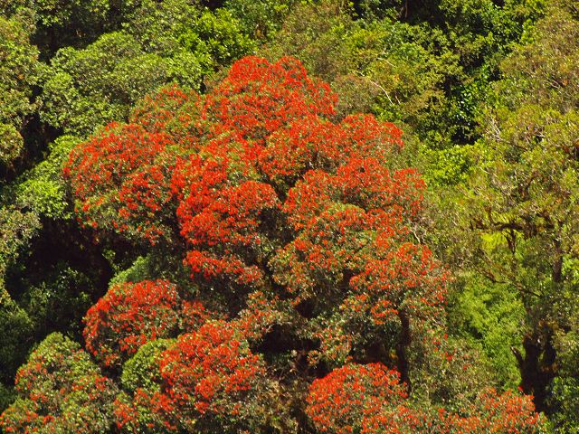 | Pōhutukawa (Metrosideros excelsa) Pohutukawas wachsen gewöhnlich bis zu einer Höhe von 15 Metern, die Krone ist meist groß und rund ausgebildet. Einzelstehende noch größere Exemplare bilden Luftwurzeln aus, um die weit ausragende Krone besser zu stützen. Der Baum ist immergrün und bringt eine große Anzahl von roten Blüten, seltener auch gelben Blüten, hervor. | Durch diese den ganzen Baum bedeckende Blütenpracht und der Zeitraum der vollen Blüte im Südhemisphärensommer zwischen Mitte Dezember und Mitte Januar führten zur Bezeichnung „Weihnachtsbaum“. Abhängig vom Standort des Baumes können aber auch noch Ende Februar einzelne blühende Bäume gesichtet werden.von wiki |