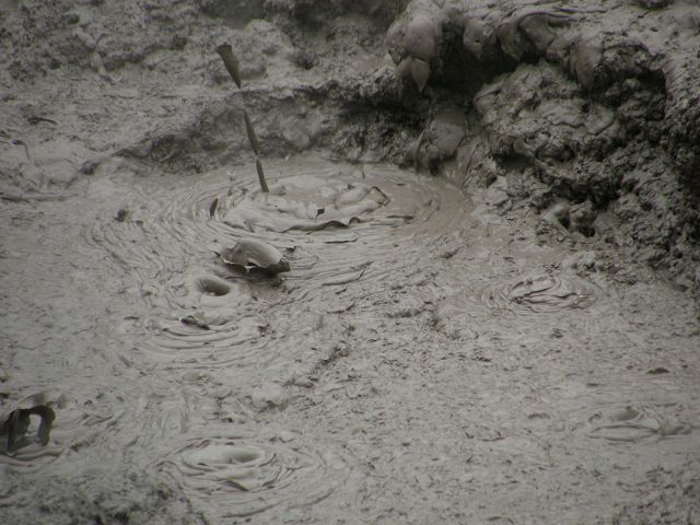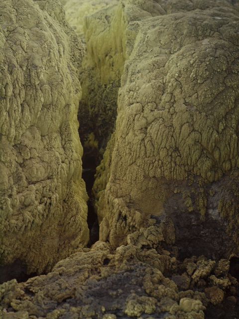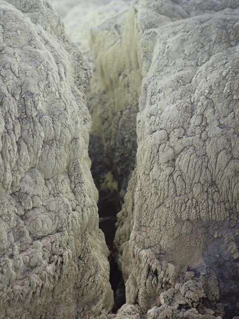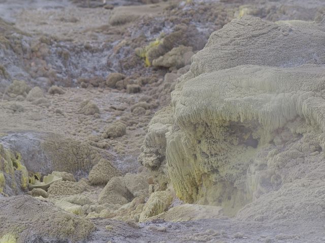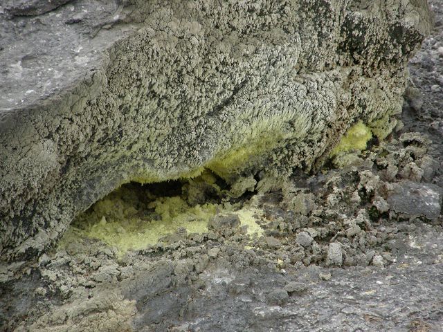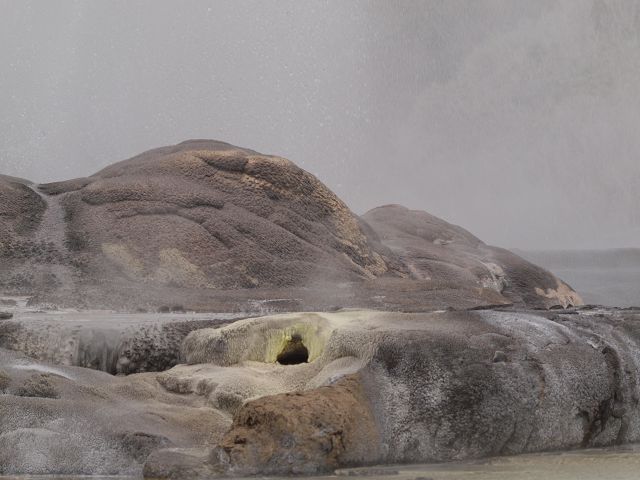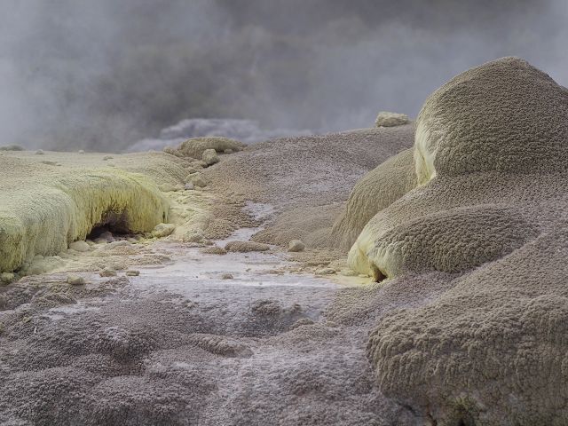 und Dampf entweichen. Diese Fumarolen erzeugen einen ständigen Nebel