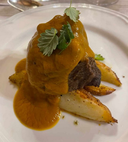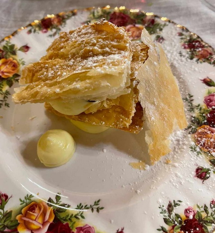 | Cantine Santa Benedetta Ristorante Nachspeise Desseert Millefeuille mit Chantilly Creme | Restaurant Hauswein Cantine Santa Benedetta Albertina 2023 Frascati DOC Selador 2023 Lazio 2023 Tre Veccie hompage https://www.santabenedetta.it/ |