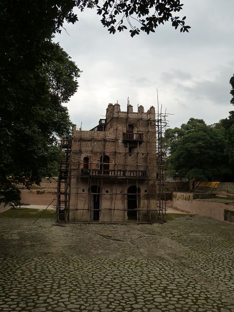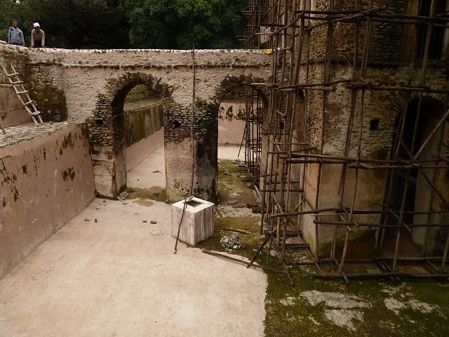 | In einem ummauerten Garten befindet sich das Bad des Fasiledas. Mitten in einem 70 x 40 m großen, tief ausgemauerten Bassin steht auf steinernen Füßen ein kleines Palais, von dem aus der Kaiser und seine Nachfolger in das kühle Nass stiegen.Es wird jedoch ein Mal im Jahr gefüllt und das Wasser gesegnet. Das kleine Palais ist zurzeit eingerüstet und soll restauriert werden . | . Etwas außerhalb liegt ein kleines Wasserschloss, das Bad des Fasiledes .Palastbezirk Fasil Ghebbi Kloster Debre Berhan Selassie,Bad des Fasilidas Witwensitz „Kusquam“ der Kaiserin Mentewab |