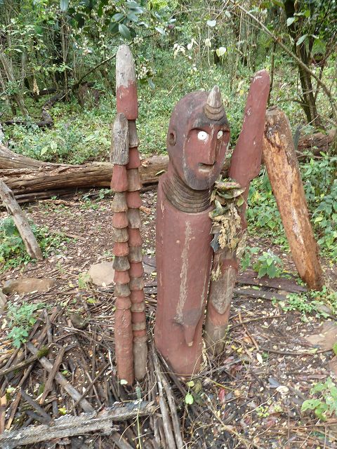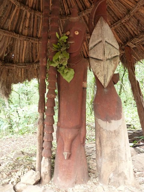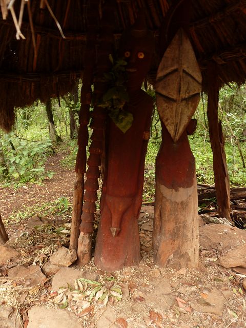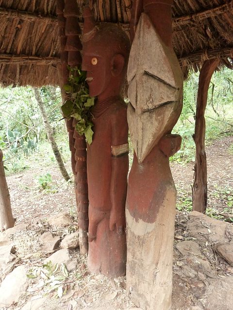 | Der König wird nach dem Tode einbalsamiert und dann wird der Verstorbene 9 Monate und 9 Wochen und 9 Tage und 9 Stunden im Dorf in einer speziellen Hütte aufbewahrt und mumifiziert und dann beigesetzt mit Totem. | Die Konso sind die Erbauer von Wagas, Denkmal-Statuen für einen toten Häuptling , Diese stilisierten Holzschnitzereien sind in Gruppen angeordnet und zeigen den Konsohäuptling mit seiner Lieblingsfrau |
