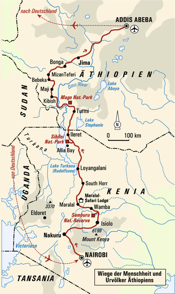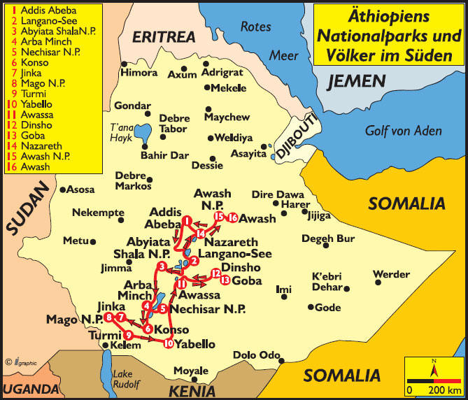 Der Weg führt am Chamo-See entlang, durch Getreide- und Baumwollfelder sowie Bananenplantagen. Wie eine Sperre des Afrikanischen Grabens wirken die terrassierten Berghänge des Konso-Landes. Die Allwetter-Schotterstraße windet sich durch Hügellandschaft und bietet schöne Panoramen. Nach dem Überqueren des Delbina wird das Land trockener und wilder. Hier wachsen Commiphora und Boswelia, deren Harz als Art Weihrauch am Straßenrand verkauft wird. Weiter westlich folgt ein Abzweig nach Erbore und Turmi. Sie folgen der Piste zu Keyafer- und Kako-Dörfern mit ihren besonderen Hütten und interessanten Bewohnern und erreichen Jinka, den Verwaltungssitz der südlichen Omo-Region mit dem farbenfrohen Markt am Samstag. Vom Bulat Hill bietet sich ein herrlicher Blick. Hotelübernacht