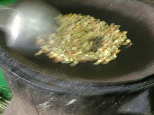 | grüne Kaffeebohen uaf Holzkohlefeuer im Zimmer rösten | |