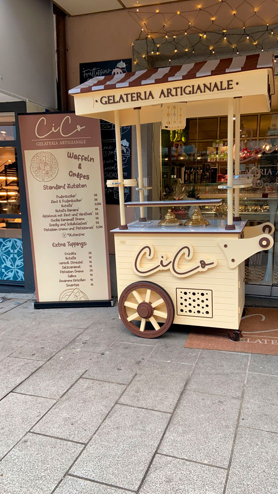 und Granite Der Eis- und Slushwagen weckt immer wieder schöne Erinnerungen und zieht bei jedem Anlass und Event die Blicke von Groß und Klein auf sich. Wenn wir von Eventwagen sprechen, denken wir sofort an den traditionellen Wagen für Eis und Granitas, serviert mit der klassischen Carapine. Aus diesem Grund darf der Modellwagen LINE in unserer Produktion von personalisierbaren Holzwagen nicht fehlen. Nicht alle Eiswagen haben die idealen Eigenschaften für ein optimales Funktionieren im Innen- und Außenbereich, insbesondere wenn Sie einige besondere Veranstaltungen wie Hochzeiten oder Zeremonien im Allgemeinen berücksichtigen. Insbesondere LINE besteht vollständig aus Tristato-Holz mit besonders anpassbaren Intarsien, die eine dekorative, aber vor allem technische Funktion haben. Die besonderen Einlagen optimieren seine Funktion auch in sommerlichen Situationen im Freien unter der Sonne. Der Wagen für Eiscreme und Slush kann mit vielen Zubehörteilen und Farben vollständig angepasst werden, im Wesentlichen hat er die folgenden Eigenschaften: Gekühlte Vertiefungen (Carapine) für 2, 4, 6, 8 Geschmacksrichtungen; Wagenbedienfeld mit Thermometer; 1 Tablett aus lebensmittelechtem Kunststoff Abm. 1/3 mit Kappe - H 15 cm; 2 Tabletts aus lebensmittelechtem Kunststoff Abm. 1/6 mit Kappe - H 15 cm; Holzräder mit Gummirand und Bremsrad; Preis ab 4.200,00 € + MwSt 22 |