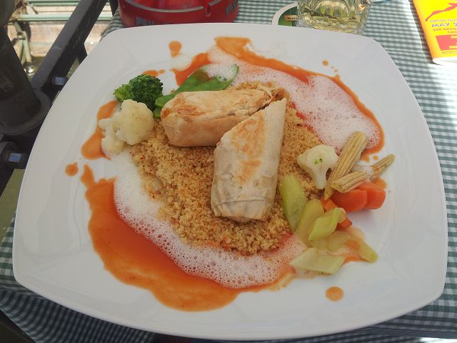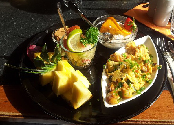 | afrikanisches Frühstück Rührei mit Fladen + Couscous mit Shrimps + frische Ananas + Kokosquark | Mittag Mainmühle |