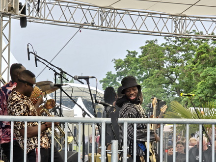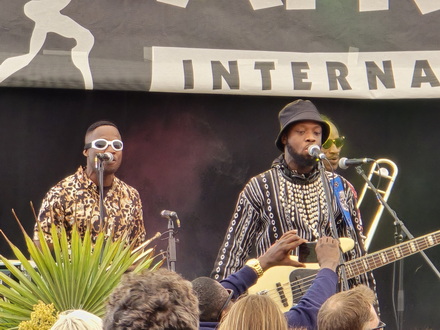 Santrofi (Ghana) Santrofi ist eine kürzlich gegründete Band aus Ghana, die klassisches Highlife spielt. Die Gruppe besteht aus jungen Musikern aus Accra unter der Leitung des Bassisten Emmanuel Ofori (bekannt von Pat Thomas & Kwashibu Area Band & Ebo Taylor). Sie sind ein Haufen turbulenter Multitalente, die dem alten Highlife, das im letzten Jahrhundert entstanden ist, einen starken zeitgenössischen Impuls verleihen. Rhythmen, Melodien und verschiedene Sprachen fließen nahtlos zusammen, mehrere Gitarren, groovige Basslinien, traditionelle ghanaische Perkussion, einzigartige Bläserarrangements und harmonische Background-Stimmen sorgen für einen aufregenden, swingenden und frischen Sound. Die Band hat mehrere Sänger, die abwechselnd als Leadsänger auftreten, aber auch die anderen Musiker wechseln während des Konzertes ständig die Instrumente. Es scheint chaotisch zu sein, aber es ist eine streng geplante Show. |
