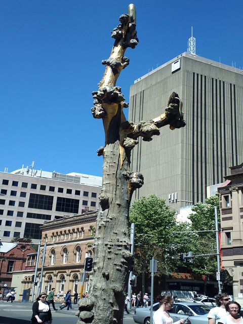 Sydney  Chinatown  Street    tree painted gold branchless In Chinatown  created by artist Lin Li in 1999 Golden Water Mouth Verehrung der Chinisen die in Australien was geworden sind. Sydney  Bus + Street  Woolloomooloo