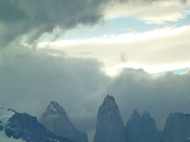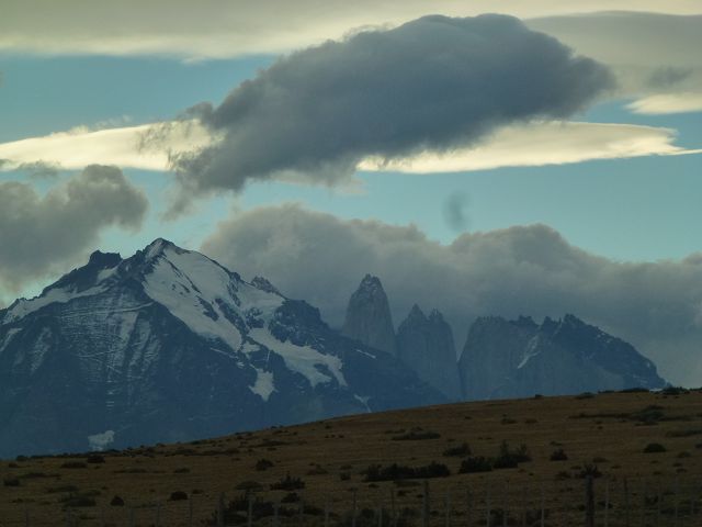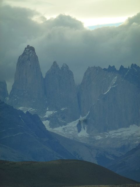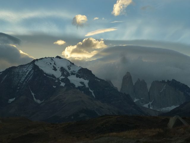 Torres del Paine  in der Dämmerung mit Wolke Torres del Paine  mit Kondor