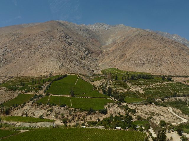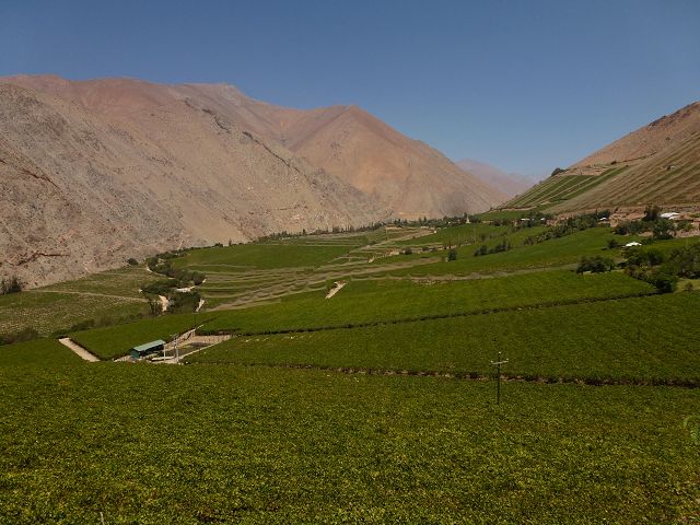 das wunderschön-grüne Flusstal des Rio Elqui. Hier gedeihen die Trauben für