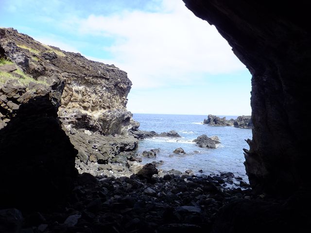 Osterinsel - Rapa Nui MoaiAna Kaitangata (Hanga Roa)Die Höhle hat Zugang zum Meer und diente den Botten als Schutz und