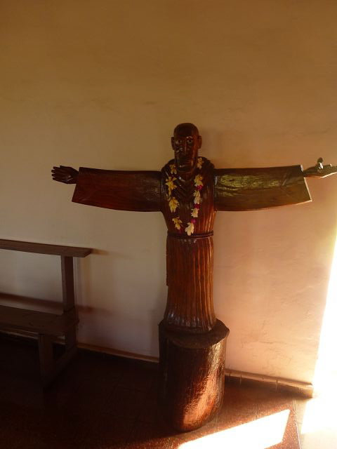 | Marienstatue mit Vogelmann auf dem Kopf Hanga Roa Kirche Iglesia Santa Cruz | Christus mit Vogelmann auf dem Kopf |