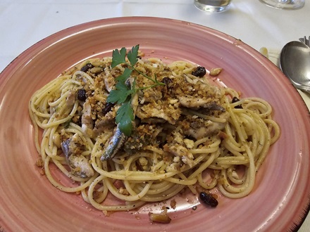 Sphagetti alla Palermitana Sardellen Pinienkerne Rosinen Wildfenchel Semmelbrösel